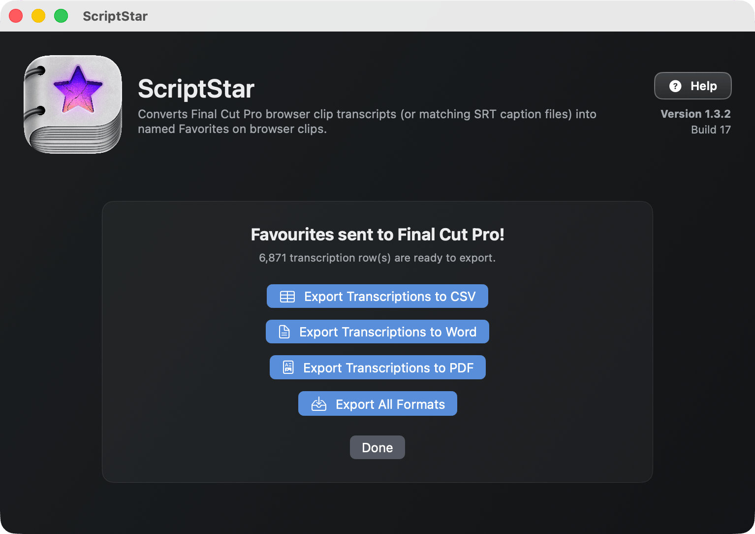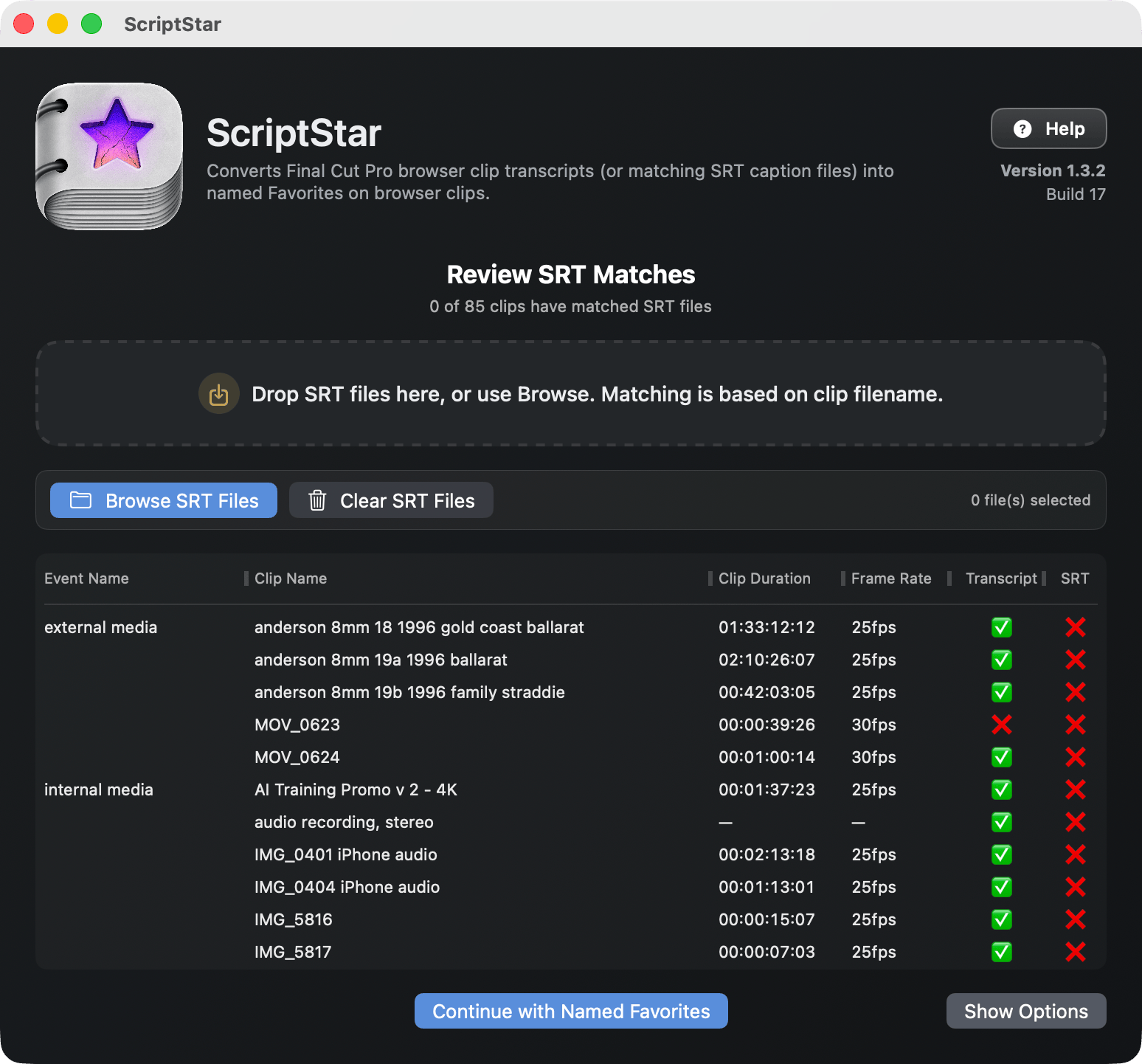 Lastly, if you had already applied Favorite ranges to clips or clip ranges before using ScriptStar, they will be converted into a new keyword called Favorites ⭐️. Each converted event will include this keyword collection, and you can apply this keyword the same way you would have applied favorites before.